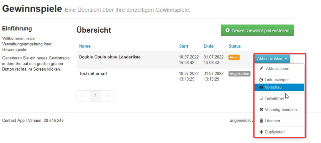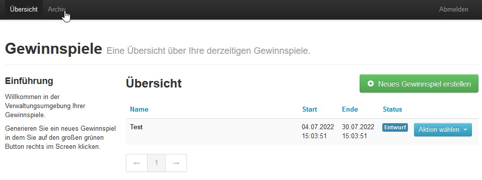Auf der Übersichtsseite sehen Sie auch eine Liste der bereits angelegten Gewinnspiele.