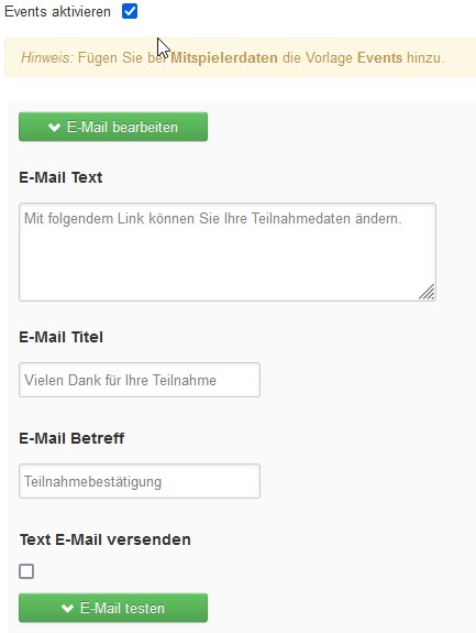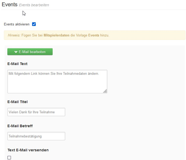 Sie können die Texte der E-Mail, welche an den Teilnehmer verschickt wird, ändern. Klicken Sie dazu auf „E-Mail bearbeiten“.