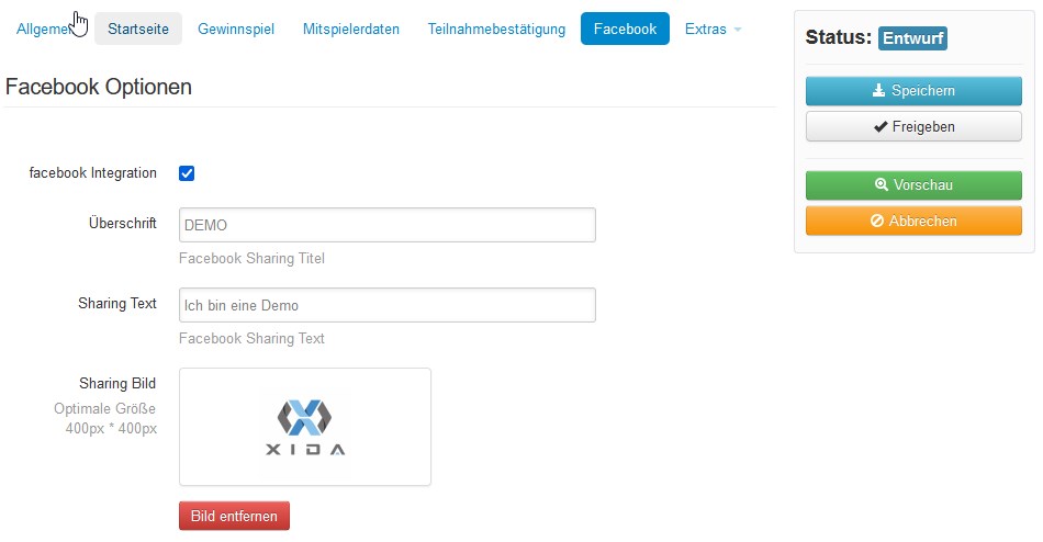 Administrationsbereich – Gewinnspiel anlegen / bearbeiten